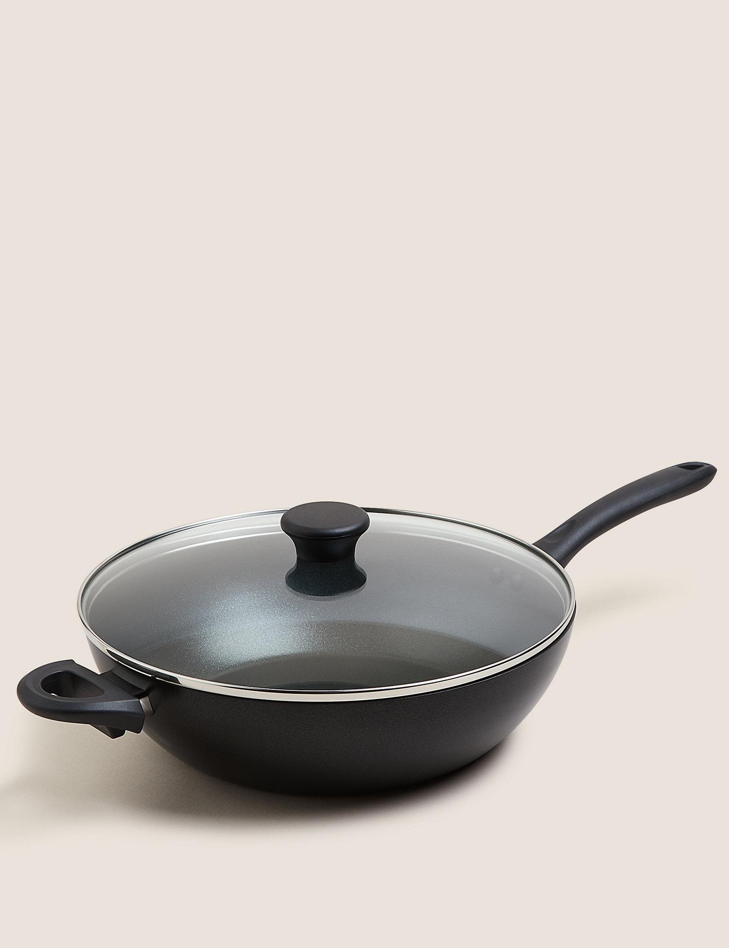 Perfect your weekend brunch with our durable frying pan. It’s made from aluminium, which evenly distributes heat for great results, with a triple-coated non-stick interior and tough exterior to prevent scratches and chips. The non-stick coating also means you need less oil for cooking, and makes cleaning easier. This kitchen essential features a magnetic base and soft-grip handle. It’s suitable for use on all hobs including induction. And when you’re finished you can just pop it in the dishwasher.